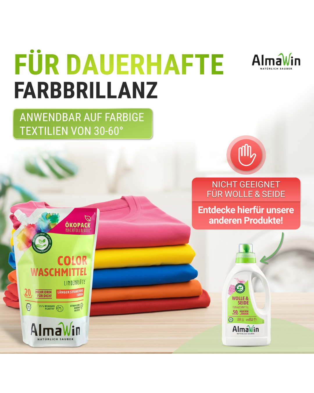 Das AlmaWin Color Waschmittel im umweltfreundlichen ÖkoPack bringt deine farbige Wäsche zum Strahlen. Der blumige Lindenblütenduft verleiht der Wäsche eine dezente Frische, während die Farben dank der schonenden Rezeptur ihre Brillanz bewahren. AlmaWin verzichtet dabei komplett auf Enzyme und setzt auf natürliche Inhaltsstoffe, die deine Textilien pflegen und gleichzeitig die Umwelt schonen.