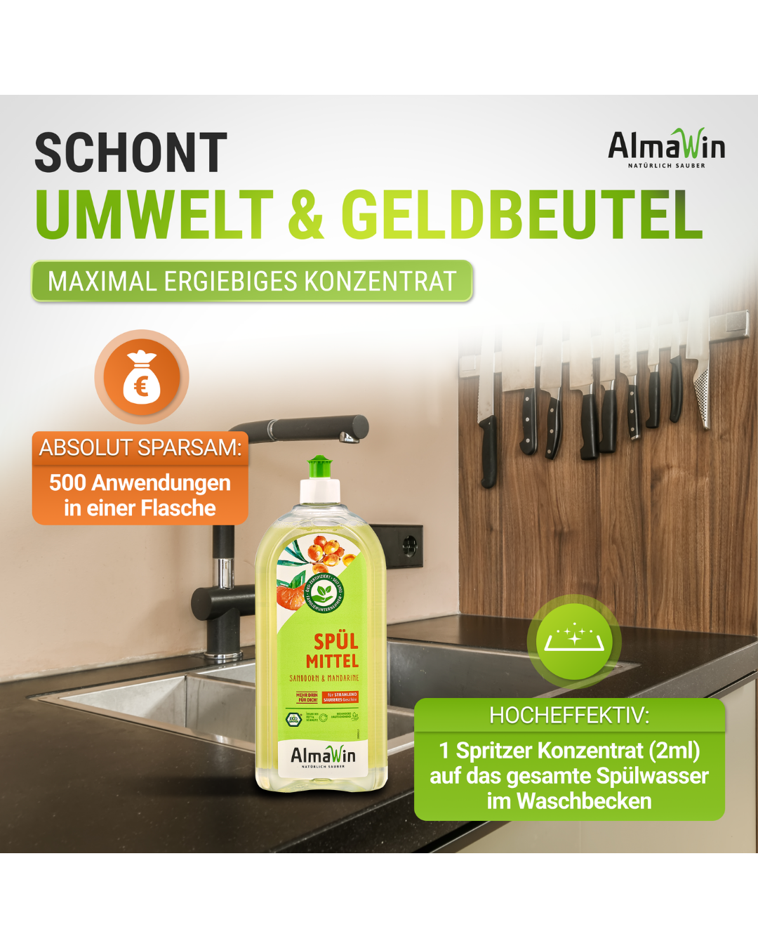 Ein Spritzer (2 ml) ins Spülwasser genügt. Nur bei sehr fettigen Pfannen und Töpfen sollte höher dosiert werden. Für die manuelle Geschirrreinigung. AlmaWin Spülmittel bitte sparsam dosieren.