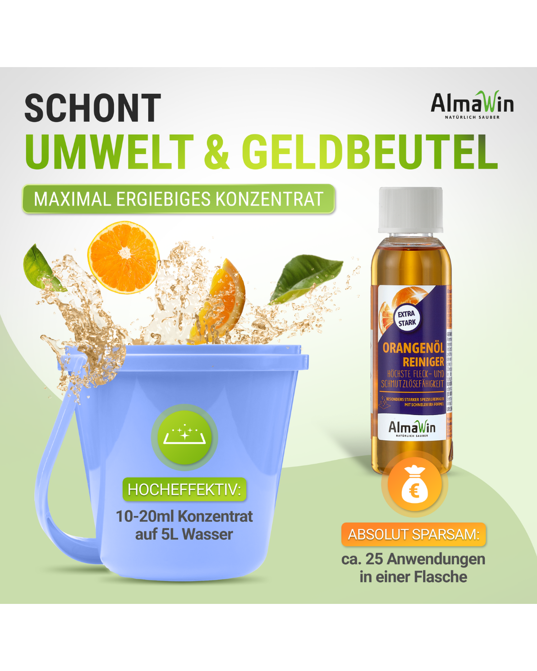 Bei greenist setzen wir auf Produkte, die sowohl effektiv als auch umweltbewusst sind. Der AlmaWin Orangenöl-Reiniger Extra Stark überzeugt uns durch seine außergewöhnliche Reinigungsleistung und die Verwendung natürlicher Inhaltsstoffe. Die Orangenterpene aus den Schalen der Zitrusfrüchte bieten eine starke Lösekraft für hartnäckige Verschmutzungen, während der frische Orangenduft eine angenehme Reinigungserfahrung schafft.