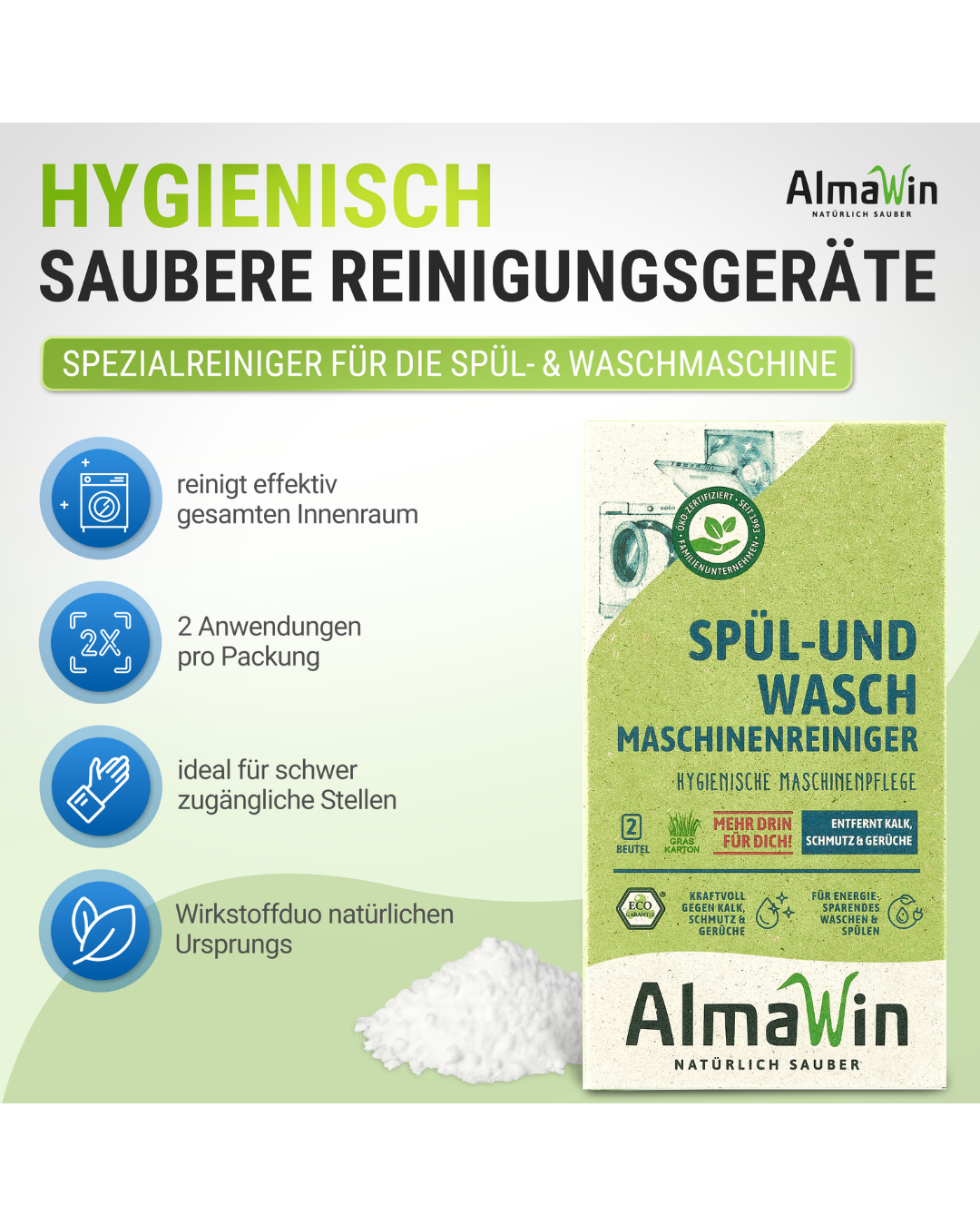 Anwendung in der Spülmaschine: Dosierung: 1 Beutel für einen Reinigungsgang verwenden. Dosierfach mit dem AlmaWin Spül- und Waschmaschinen Reiniger befüllen, Klappe schließen. Das restliche Pulver auf der Fläche der offenen Spülmaschinentüre verteilen und Spülprogramm ohne Geschirr und ohne Geschirrspülmittel mit höchster Temperatur starten (mind. 60°C). Nach der Reinigung ist die Maschine sofort wieder einsatzbereit. Anwendung in der Waschmaschine: Dosierung bei Grundreinigung: 2 Beutel. Dosierung bei regelmäßiger Anwendung: 1 Beutel. AlmaWin Spül- und Waschmaschinen Reiniger in das Dosierfach der Waschmaschine geben. Hauptwaschgang (mind. 60°C) ohne Vorwäsche, ohne Waschmittel und ohne Wäsche starten. Nach der Reinigung ist die Maschine sofort wieder einsatzbereit. Tipp: Eine regelmäßige Anwendung trägt zum Schutz und Erhalt der Maschine bei, verlängert so deren optimale Leistungsfähigkeit und sorgt für energiesparendes Spülen oder Waschen.