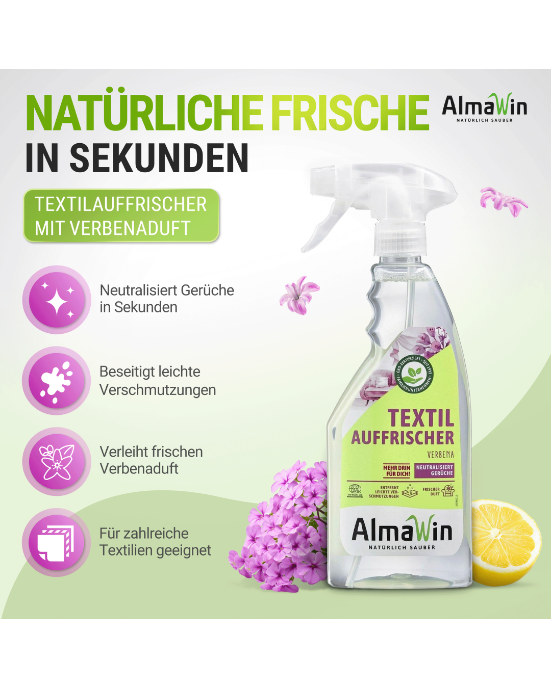 <5% nichtionische Tenside (Zuckertenside), anionische Tenside (Waschnuss-Extrakt), Duftstoffe (natürliches etherisches Eisenkraut-Limonenöl), LIMONENE, CITRAL, GERANIOL, LINALOOL. Weitere Inhaltsstoffe: Wasser, Alkohol, Natriumcitrat, Natriumbicarbonat, MGDA-Na3, Zinkricinoleate, Milchsäure. 99 % der Inhaltsstoffe sind natürlichen Ursprungs.