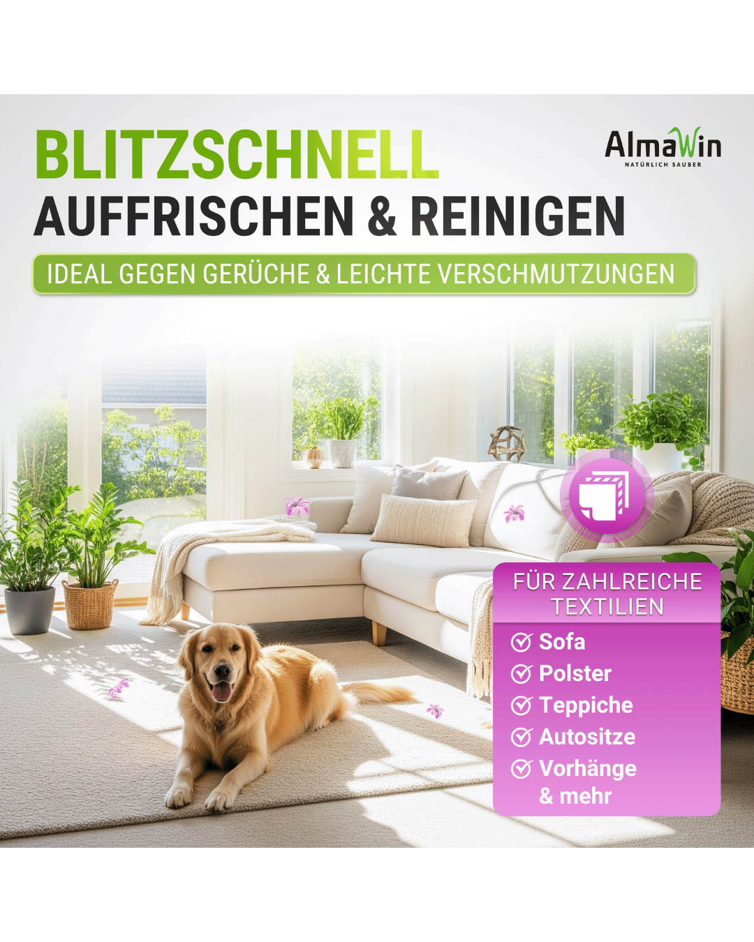 Zum Reinigung: Schaumfunktion des Sprayers einstellen, indem das Sieb vorgeklappt ist. Die Oberfläche vor der Anwendung gründlich absaugen. Sparsam auftragen und mit Bürste, Schwamm oder Tuch einmassieren. Bei Polstern die Durchnässung des darunterliegenden Schaumstoffes vermeiden. Trocknen lassen und erneut absaugen. Zum Auffrischen: die Sprayfunktion aktivieren, in dem das Sieb weggeklappt wird. Aus ca 50 cm Abstand die Fläche fein einsprühen. Trocknen lassen. Um eine Randbildung zu vermeiden, immer die ganze Textilfläche behandeln. Pflegehinweise des Herstellers beachten. Materialverträglichkeit an verdeckter Stelle testen.