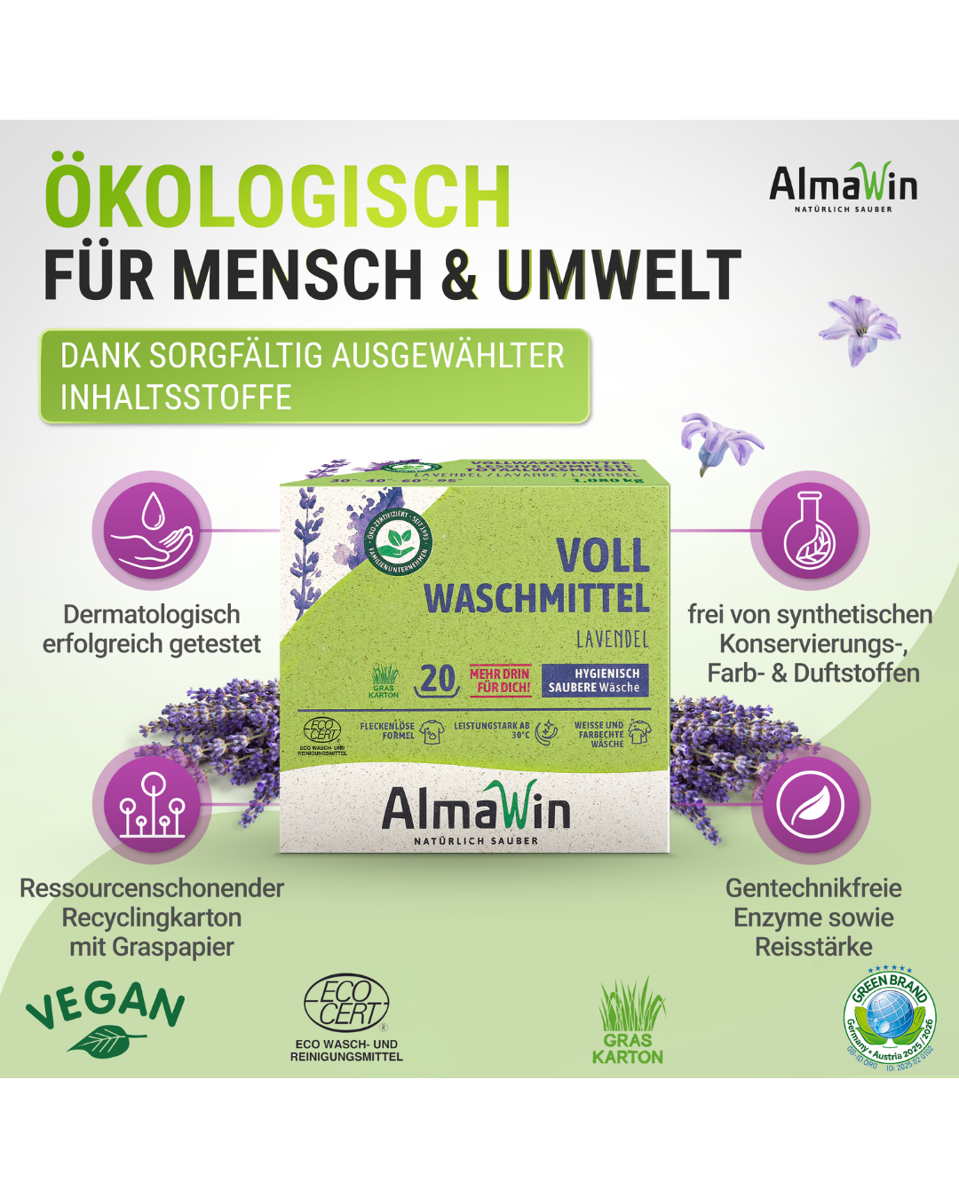 Bei greenist steht der Mensch im Mittelpunkt, und das zeigt sich in der Auswahl unserer Produkte. Wir legen großen Wert darauf, dass alles, was du bei uns findest, höchsten Ansprüchen an Natürlichkeit und Nachhaltigkeit gerecht wird. Das AlmaWin Vollwaschmittel passt perfekt zu unseren Werten, da es ohne synthetische Duft-, Farb- und Konservierungsstoffe auskommt und auf vegane sowie gentechnikfreie Inhaltsstoffe setzt. Unsere Philosophie ist es, Produkte anzubieten, die nicht nur effektiv, sondern auch umweltbewusst sind. Mit dem AlmaWin Vollwaschmittel entscheidest du dich für eine verantwortungsvolle und natürliche Reinigungslösung, die gleichzeitig deinen hohen Ansprüchen an Qualität entspricht. Indem du AlmaWin Waschmittel wählst, unterstützt du eine nachhaltige Lebensweise, die sowohl deiner Wäsche als auch der Umwelt zugutekommt.