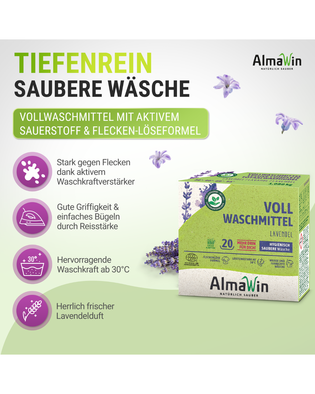 AlmaWin Vollwaschmittel kombiniert starke Reinigungskraft mit natürlichen Inhaltsstoffen und einem angenehmen Lavendelduft. Entwickelt für alle weißen und farbechten Textilien, sorgt es bereits ab 30°C für strahlende Sauberkeit. Der Waschkraftverstärker aus aktivem Sauerstoff entfernt auch hartnäckige Flecken zuverlässig, während gentechnikfreie Enzyme und Reisstärke die Wäsche griffig machen und das Bügeln erleichtern.