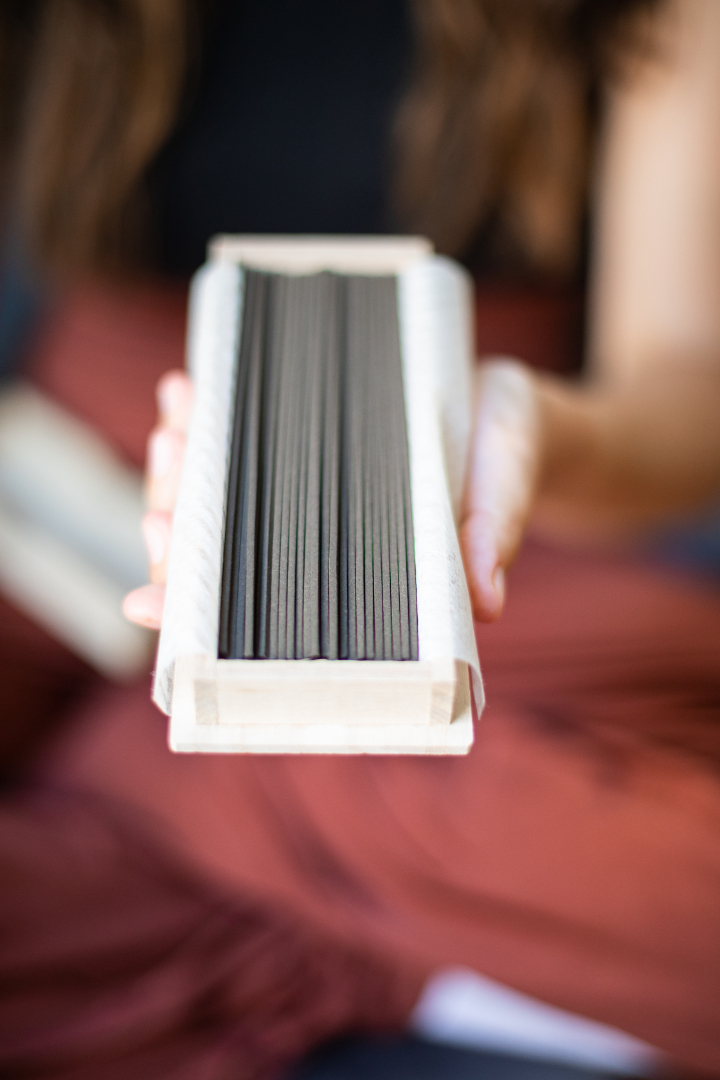Räucherstäbchen an der Spitze anzünden, dann die Flamme auspusten. Stäbchen in den Räucherstäbchenhalter stecken, um die Asche aufzufangen.