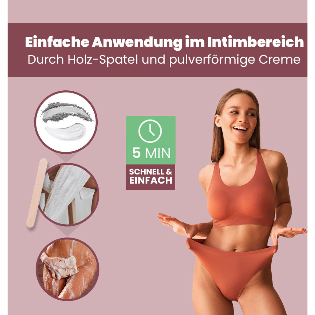Dank der einzigartigen pulverförmigen Rezeptur lässt sich die Creme frisch anrühren und individuell anpassen. Aloe Vera spendet der Haut nach der Anwendung ein angenehm gepflegtes Gefühl. Durch die Kombination aus Calciumverbindungen und pflanzlichen Inhaltsstoffen werden unerwünschte Härchen effektiv entfernt – ohne Ziepen, Brennen oder Rasurbrand.