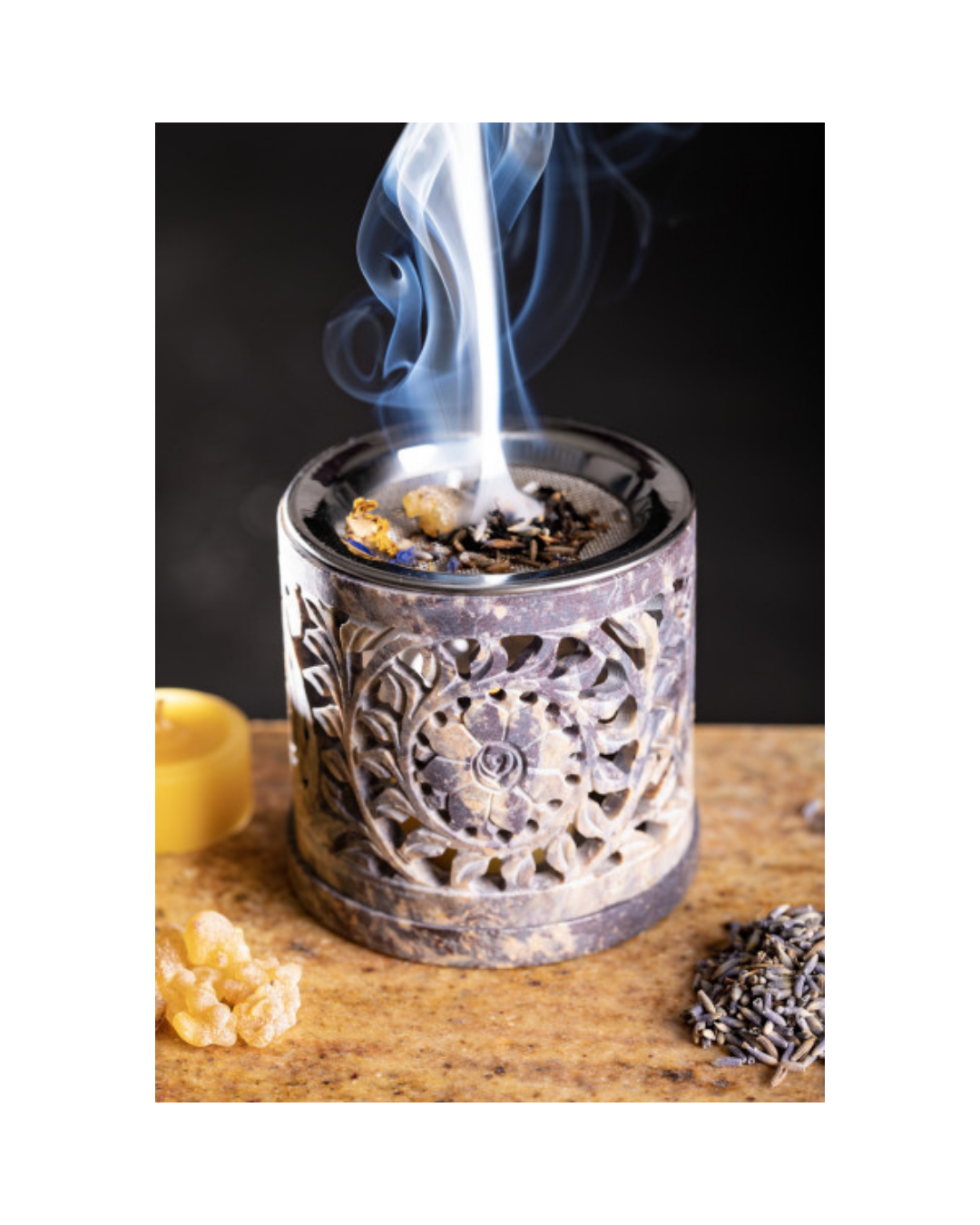 - Siebgefäß Indra aus handgeschnitztem Speckstein im alt-orientalischen indischen Stil. Fein graviert; mit Filzgleitern zum Schutz vor Kratzern. H 8 cm, Ø 8,5 cm.