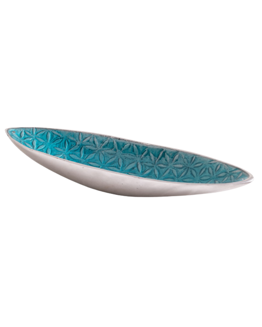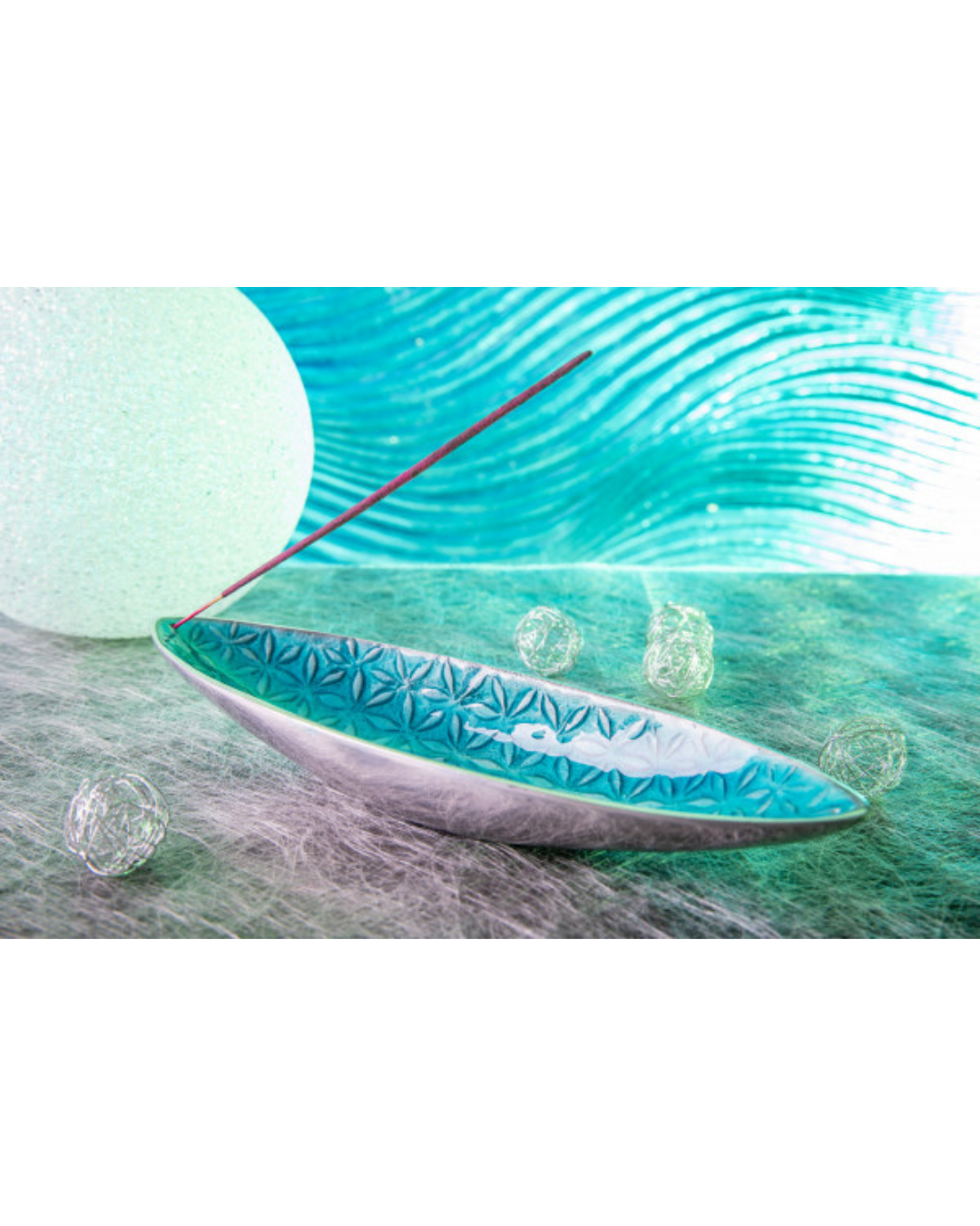 • Schmaler Schiffchenhalter mit türkisfarbener Glasur und Blume-des-Lebens-Relief. Maße 27×8 cm - dekoratives Räucherzubehör im mystischen Ägypten-Stil.