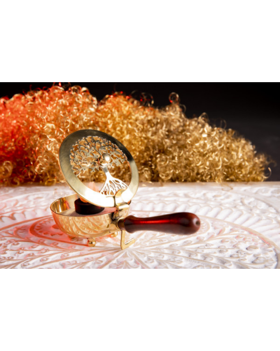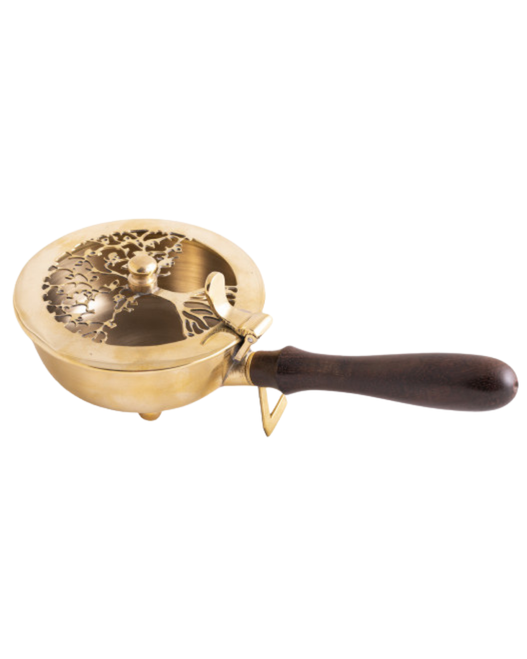 • Tragegefäß Yggdrasil - Messing mit Holzgriff. Perfekt für Raum- und Aura-Reinigungen: leicht zu führen, ideal zum Ausräuchern von Ecken. Maße H7×L20ר9 cm.