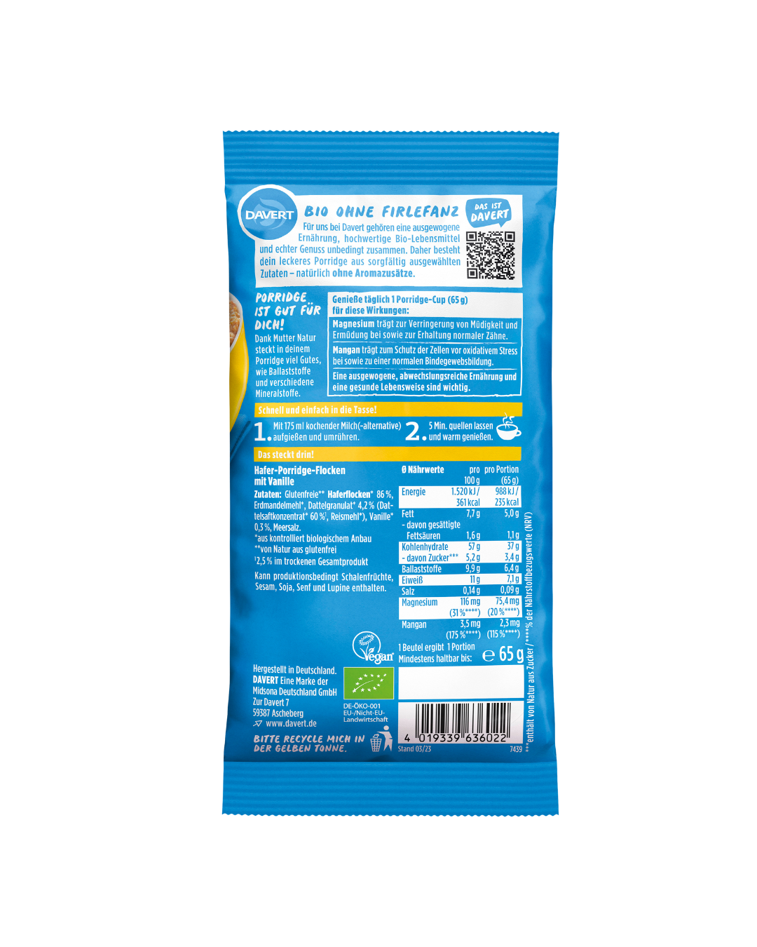 Davert Bio Porridge-Cup Vanille Glutenfrei 65g Produktdetaljer