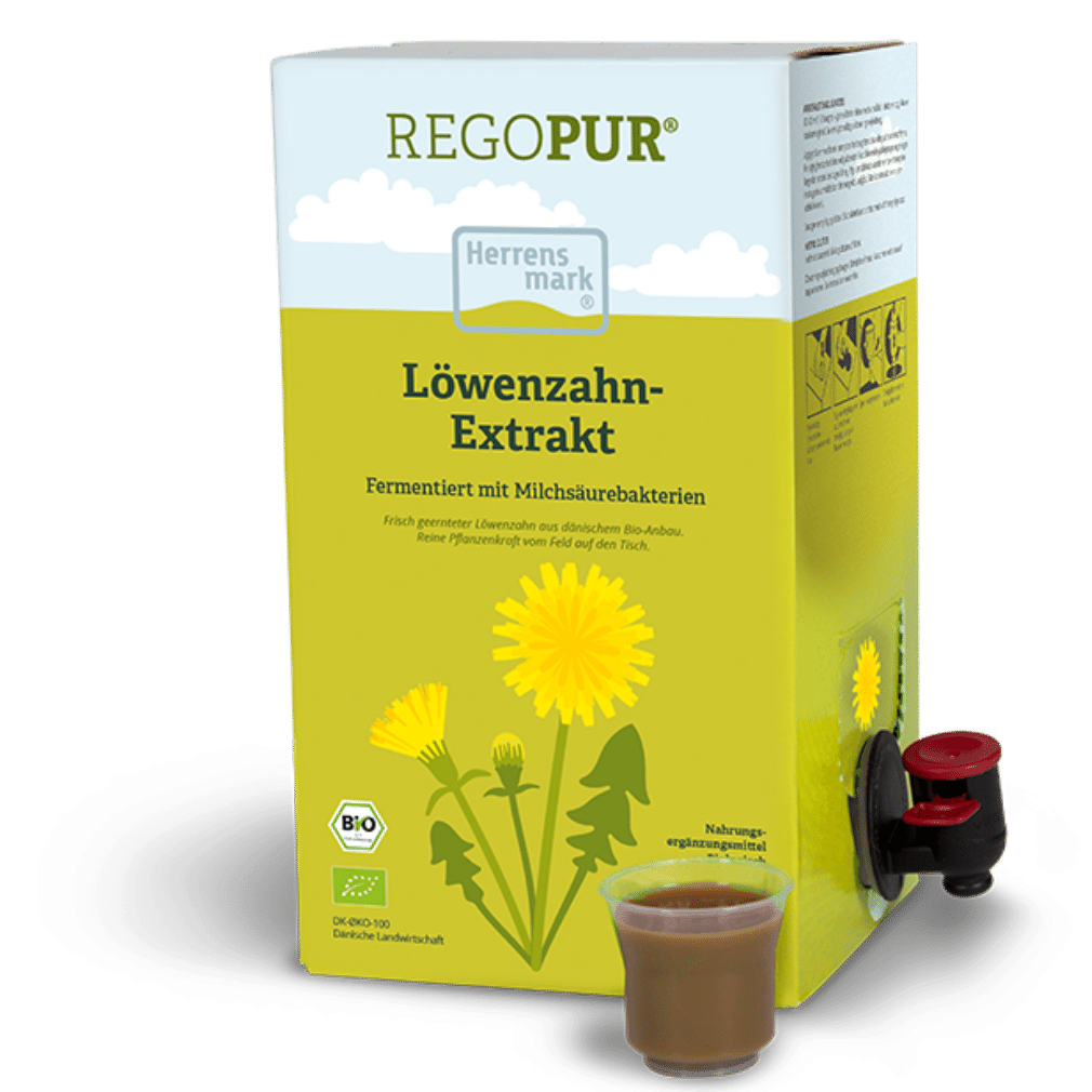 REGOPUR ist säuerlich und bitter. Er sollte aber dennoch pur eingenommen werden. Bei Bedarf kann aber Fruchtsaft, am besten Johannisbeersaft, eingemischt werden. Vorzugsweise gekühlt einnehmen. Für optimale Ergebnisse sollte REGOPUR täglich eingenommen werden. Wir empfehlen die Einnahme von Herrens Marks Löwenzahnextrakt jeweils zu einer Mahlzeit, am besten morgens und abends. Bei chronischen Zuständen wird die Einnahme von 90 ml ( 3 Dosierbechern) täglich bis zum Eintreten einer spürbaren Wirkung empfohlen, hiernach wird die Menge reduziert auf 60 ml täglich. Im Rahmen einer Kur sollte der Löwenzahn-Extrakt über mindestens 3 Monate hinweg wie folgt eingenommen werden: 1. Woche: 1 Dosierbecher am Tag (30 ml). 2. Woche: 2 Dosierbecher am Tag (60 ml). 3. Woche: 3 Dosierbecher am Tag (90 ml). Darauffolgende Wochen: 1-3 Dosierbecher am Tag (30-90 ml)