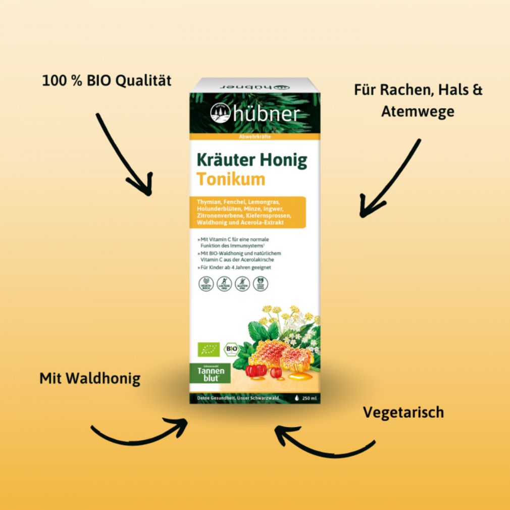 Das hübner® Kräuter Honig Tonikum ist ein wertvolles Nahrungsergänzungsmittel für die kalte Jahreszeit. Mit BIO-Waldhonig und natürlichem Vitamin C aus der Acerolakirsche ist es besonders angenehm für Hals, Rachen und Atemwege. Ätherische Öle aus erlesenen Kräutern und Ingwer sorgen für zusätzliches Wohlbefinden und unterstützen die Gesundheit in der Erkältungszeit.