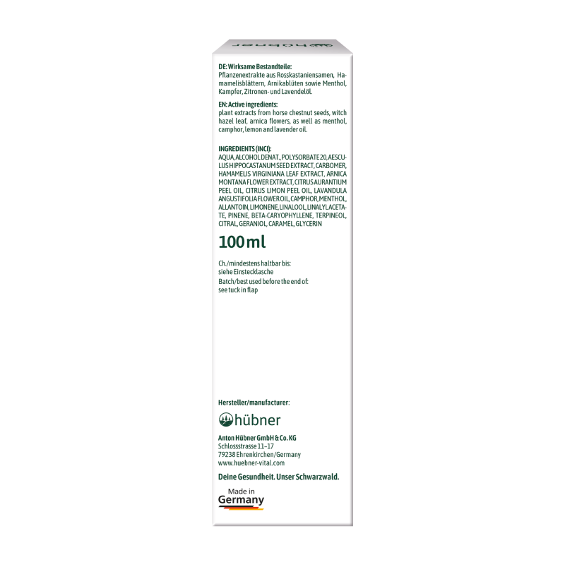 AQUA, ALCOHOL DENAT., POLYSORBATE 20, AESCULUS HIPPOCASTANUM EXTRACT, CARBOMER, HAMAMELIS VIRGINIANA LEAF EXTRACT, ARNICA MONTANA FLOWER EXTRACT, CITRUS LIMON PEEL OIL, CITRUS MEDICA LIMONUM EXTRACT, LAVANDULA ANGUSTIFOLIA OIL, CAMPHOR, MENTHOL, ALLANTOIN, LIMONENE, LINALOOL, CITRAL, GERANIOL, CARAMEL, GLYCERIN.