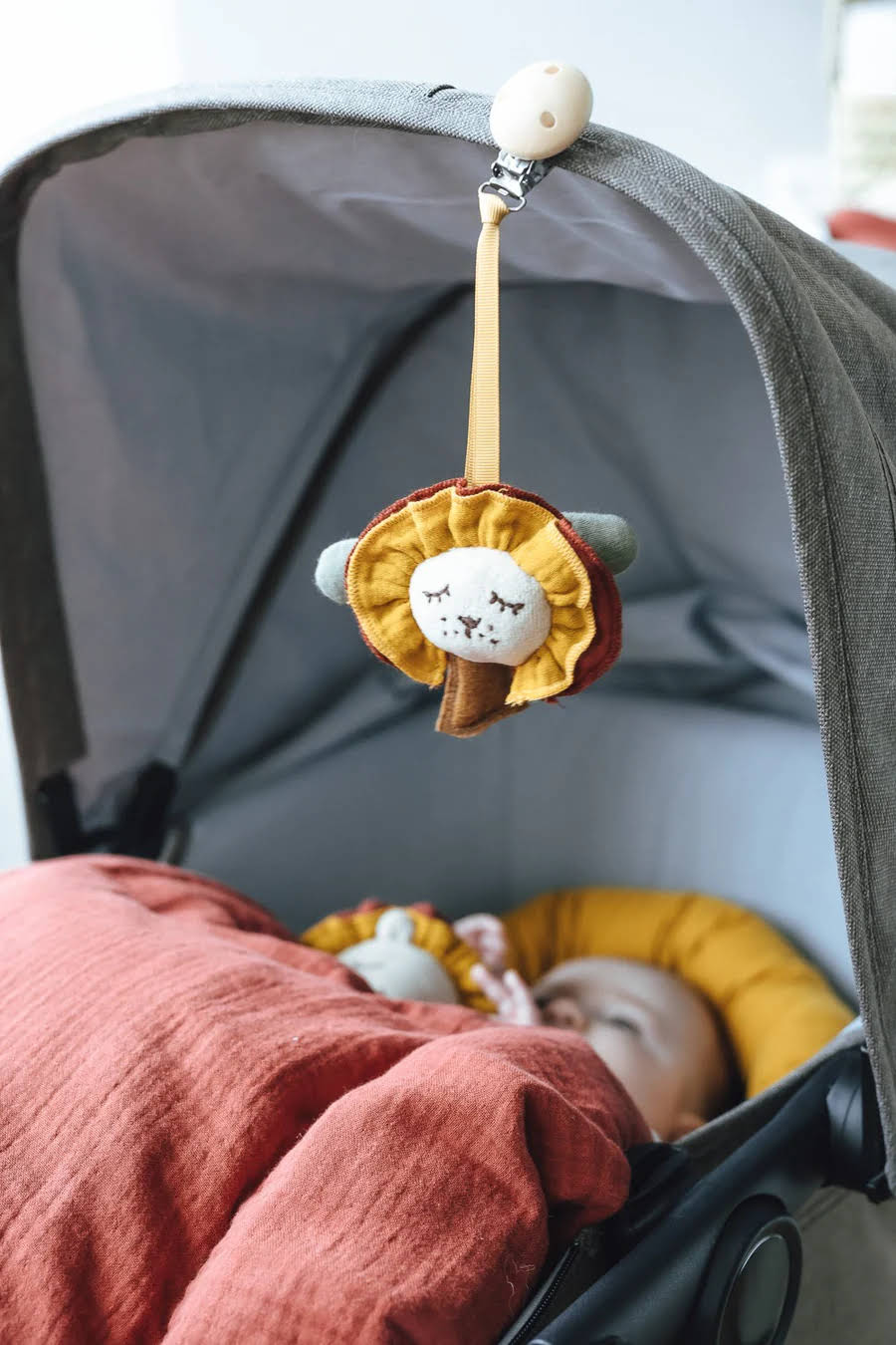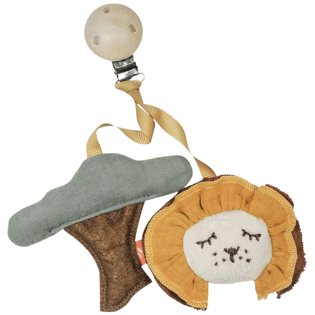 Im Inneren des kleinen Löwen ist eine kleine Rassel eingearbeitet, die zum Greifen und Erkunden anregt. Diese akustische Komponente fördert die auditive Wahrnehmung deines Babys und unterstützt die Entwicklung der motorischen Fähigkeiten durch das gezielte Greifen nach dem Anhänger.