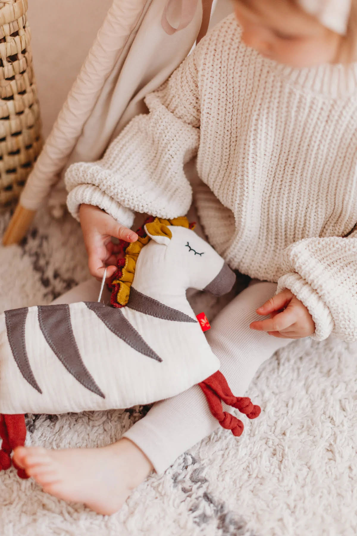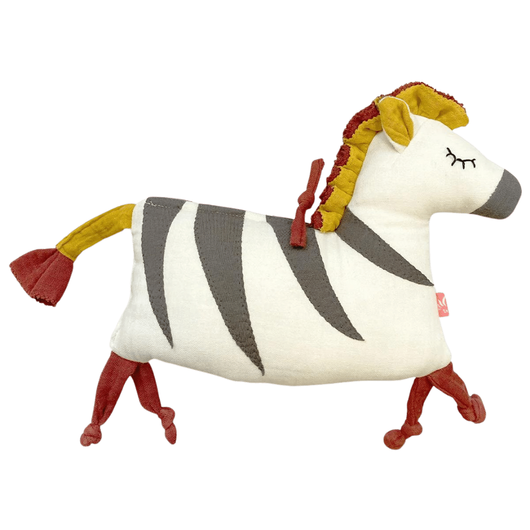 Das Zebra ist speziell für Babys ab 6 Monate konzipiert und aus 100% Bio-Baumwolle gefertigt, was es besonders sanft zur empfindlichen Haut von Babys macht. Die großzügigen Maße bieten genügend Oberfläche zum Kuscheln und Greifen, was das Zebra schnell zum Lieblingsspielzeug deines Babys werden lässt.