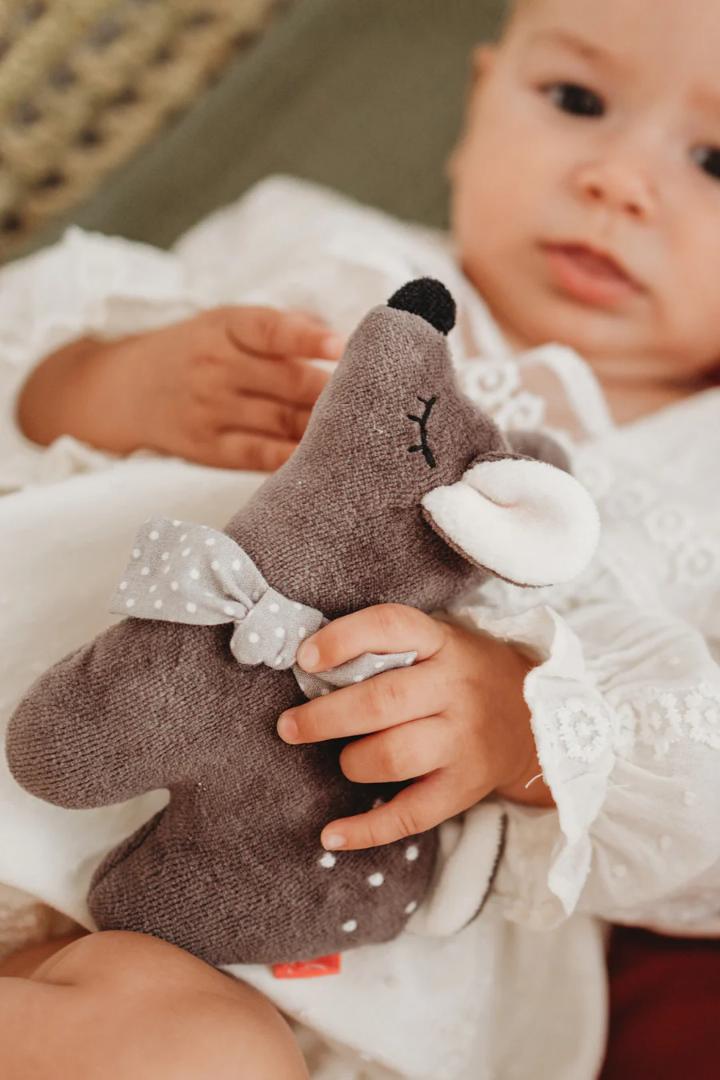 Der Rehkitz Greifling bietet eine Vielzahl an sensorischen Erlebnissen für dein Baby. Die unterschiedlichen Materialien und die integrierte Rassel fördern das Tasten und Hören, was für die frühkindliche Entwicklung von großer Bedeutung ist.