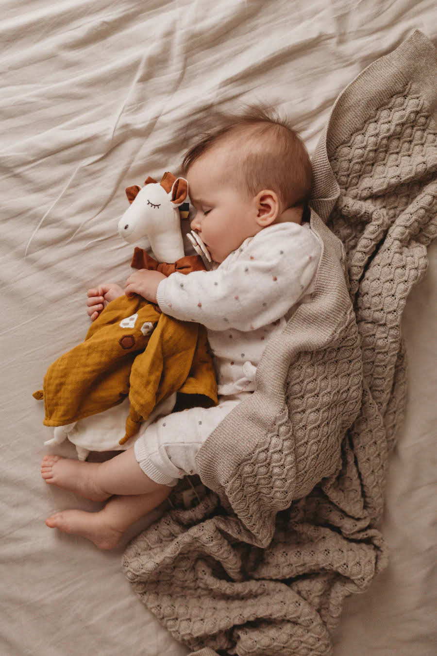 Hergestellt aus 100% GOTS-zertifizierter Bio-Baumwolle, bietet das Schmusetuch eine kuschelig weiche Oberfläche, die ideal für zarte Babyhaut ist. Es ist sanft und sicher, sodass dein Baby es zum Kuscheln, beim Einschlafen oder einfach zum Spielen nutzen kann.