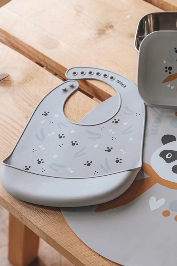 Praktische und stylische Unterstützung für die ersten Mahlzeiten: Die Kikadu Silikon Lätzchen Panda Silber Grau