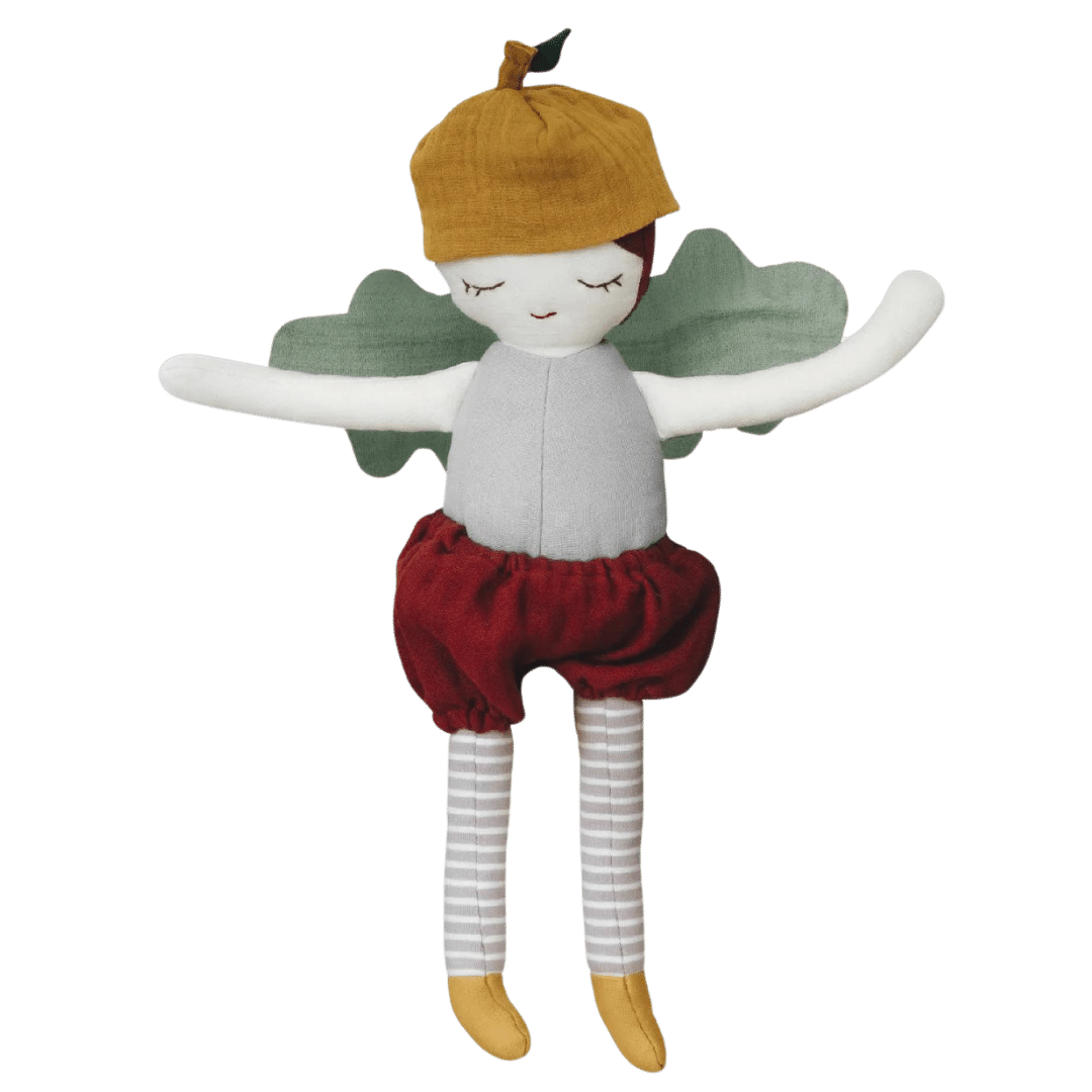 Die Waldelfen-Puppe ist aus 100% GOTS-zertifizierter Bio-Baumwolle gefertigt und mit weichen, recycelten Polyesterfasern gefüllt. Diese Materialien sind nicht nur umweltfreundlich, sondern auch besonders sanft zu empfindlicher Kinderhaut, sodass dein Kind bedenkenlos mit ihr schmusen und spielen kann.