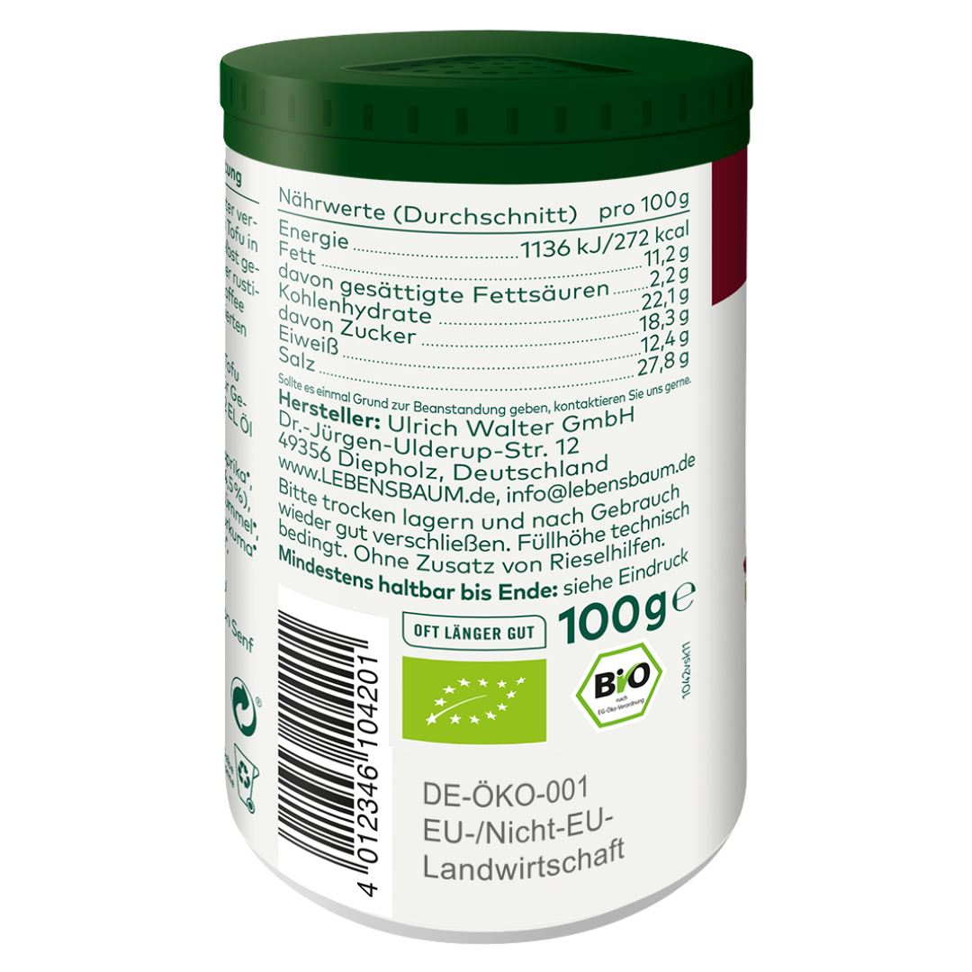 Alle Zutaten stammen aus streng kontrolliert biologischem Anbau (DE-ÖKO-001). Produziert und verpackt wird in Deutschland – für höchste Qualität, Transparenz und unverfälschten Geschmack. Bei greenist findest du Gewürze ohne künstliche Zusätze.