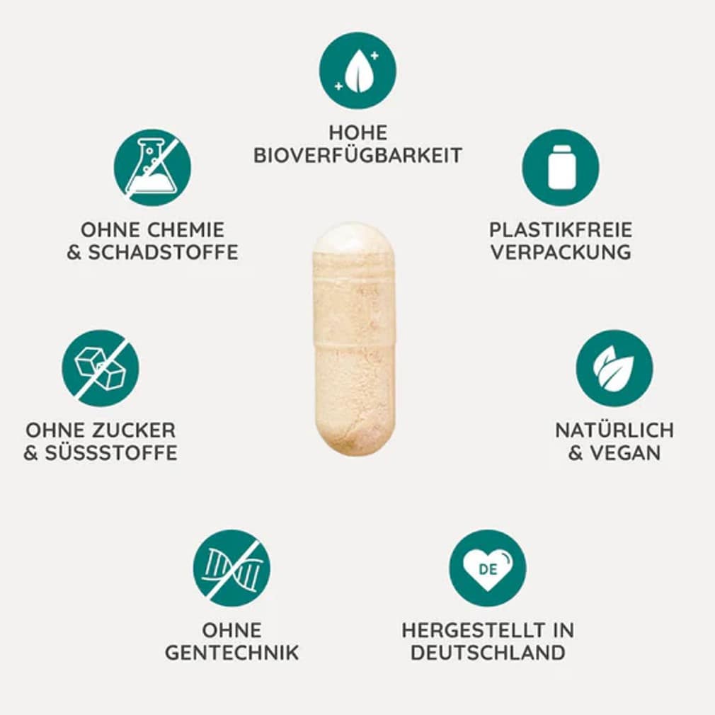 Nahrungsergänzungsmittel sind kein Ersatz für eine ausgewogene und abwechslungsreiche Ernährung sowie eine gesunde Lebensweise. Die angegebene empfohlene tägliche Verzehrmenge darf nicht überschritten werden. Außerhalb der Reichweite von kleinen Kindern lagern.