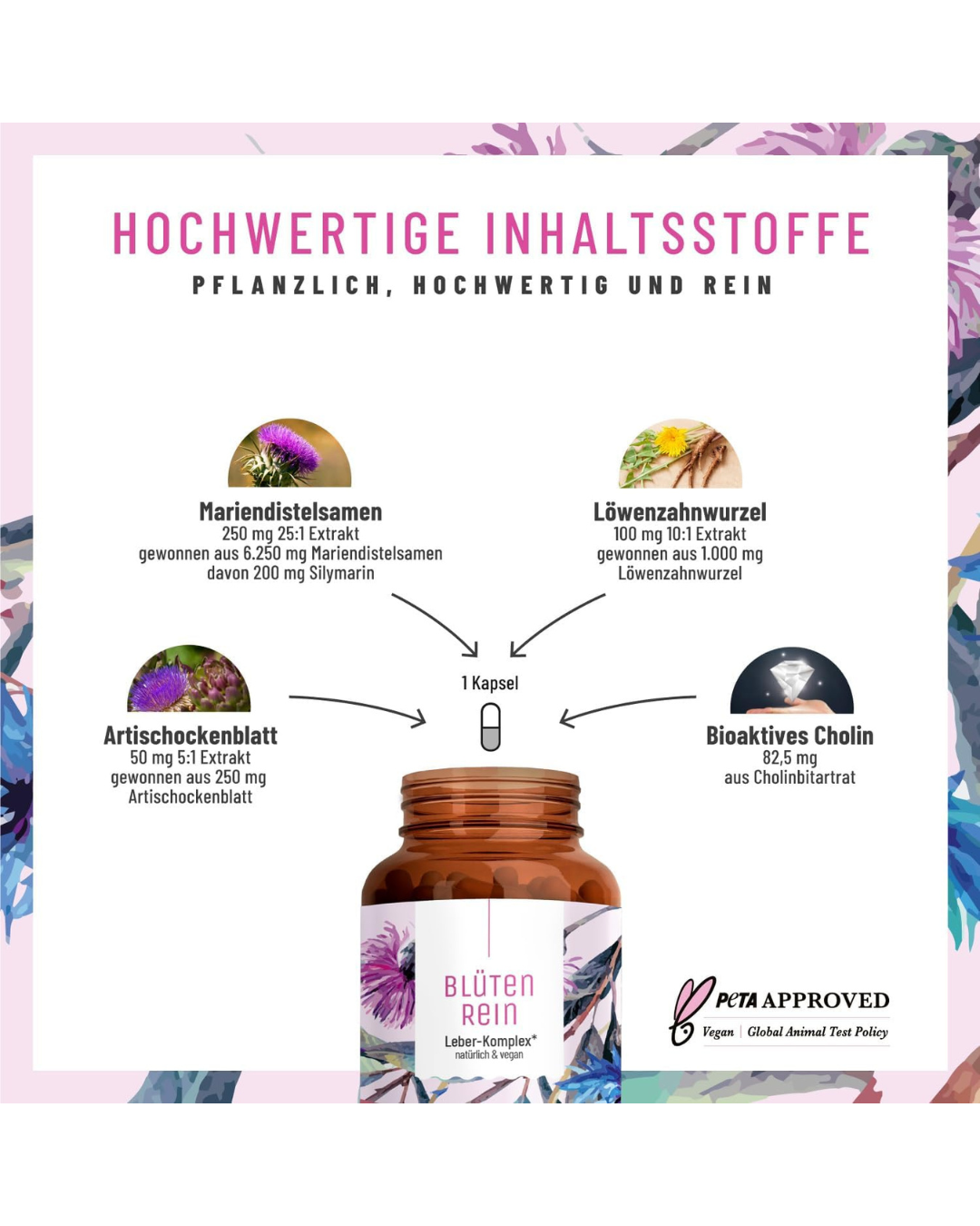 Mariendistelsamen-Extrakt 25:1(Silybum marianum, enthält 80 % Silymarin), Cholinbitartrat, Uberzugsmittel: Hydroxypropylmethylcellulose (pflanzliche Kapselhülle), Löwenzahnwurzel-Ext (Taraxacum officinale), Artischockenblatt-Extrakt 5:1(Cynara scolymus L.). *Cholin trägt zur Erhaltung einer normalen Leberfunktion bei.