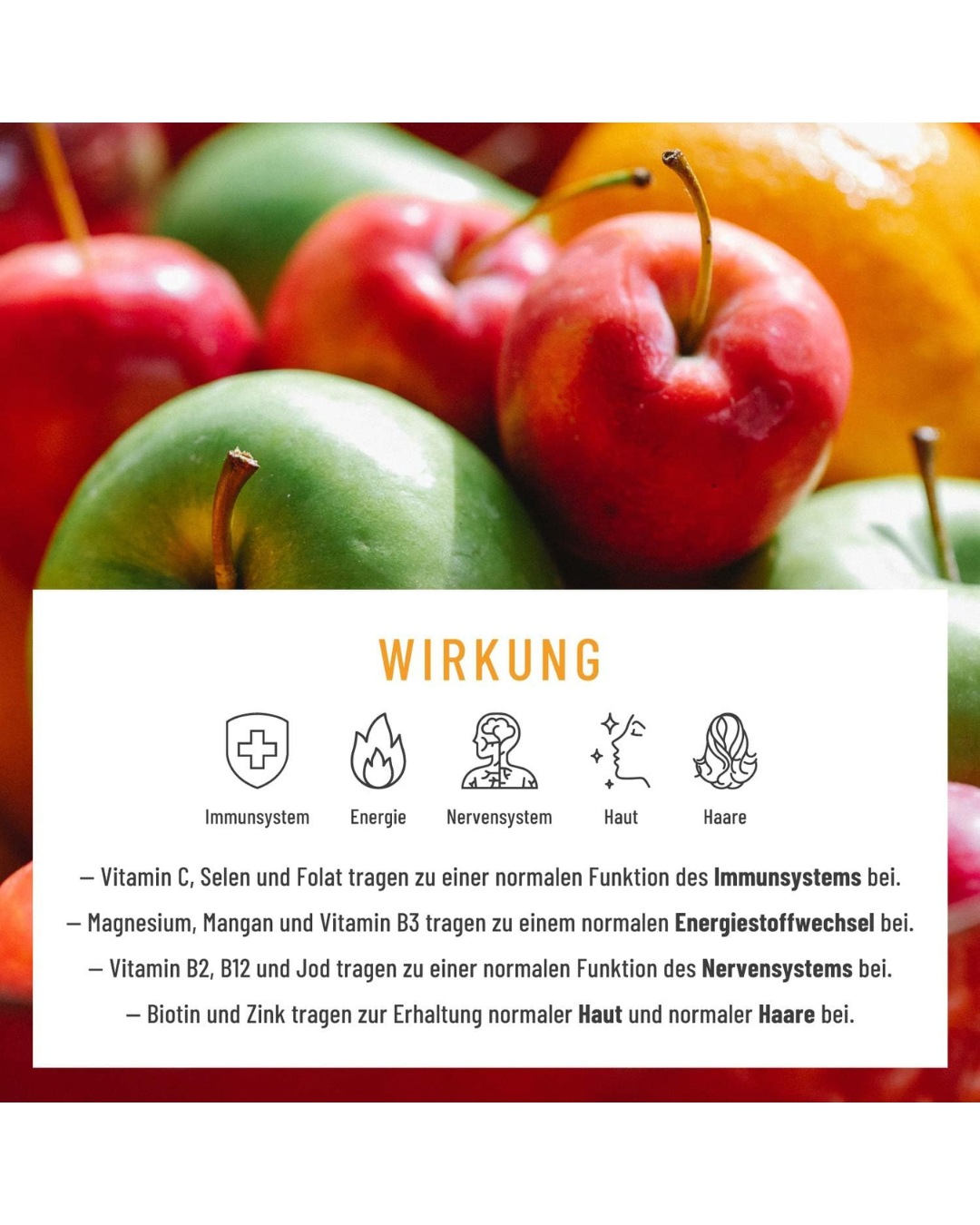 Magnesiumbisglycinat, Reismehl, Überzugsmittel: Hydroxypropylmethylcellulose (pflanzliche Kapselhülle), Acerolafruchtsaftpulver (Malpighia glabra, enthält 25 % Vitamin C), Knotentangpulver (Ascophyllum nodosum, enthält 0,087 % Iod), Taurin, Weintraubenkern-Extrakt 27:1 (Vitis vinifera L., enthält 50 % Oligomere Proanthocyanidine), Astaxanthin, Brokkoliblüten-Extrakt 35:1 (Brassica oleracea var. italica, enthält 10 % Sulforaphan), Holunderbeerenfrucht-Extrakt 4:1 (Sambucus nigra L), Bitterorangenfrucht-Extrakt 6:1 (Citrus aurantium, enthält 60 % Bioflavonoide), Aroniabeerenfrucht-Extrakt 20:1 (Aronia melanocarpa, enthält 80 % Vitamin C), Methylsulfonylmethan, Japanischer Staudenknöterichwurzel-Extrakt (Polygonum cuspidatum, enthält 98 % Trans-Resveratrol), Heidelbeerfruchtsaftpulver (Vaccinium myrtillus L.), DL-α-Tocopherylacetat, Myo-Inositol, Coenzym Q10, Zinkbisglycinat, Nicotinamid, Mangangluconat, Natriummolybdat (Molybdän(VI)), L-Selenomethionin, Retinylpalmitat, Calcium-D-Pantothenat, Natriumborat, Pyridoxal-5'-Phosphat, Riboflavin-5'-Phosphat-Natriumsalz, Thiaminhydrochlorid, Chrompicolinat, Calcium-L-Methylfolat, D-Biotin, 5'-Desoxyadenosylcobalamin. keine Zutatenlegende (100% konventionelle Zutaten)