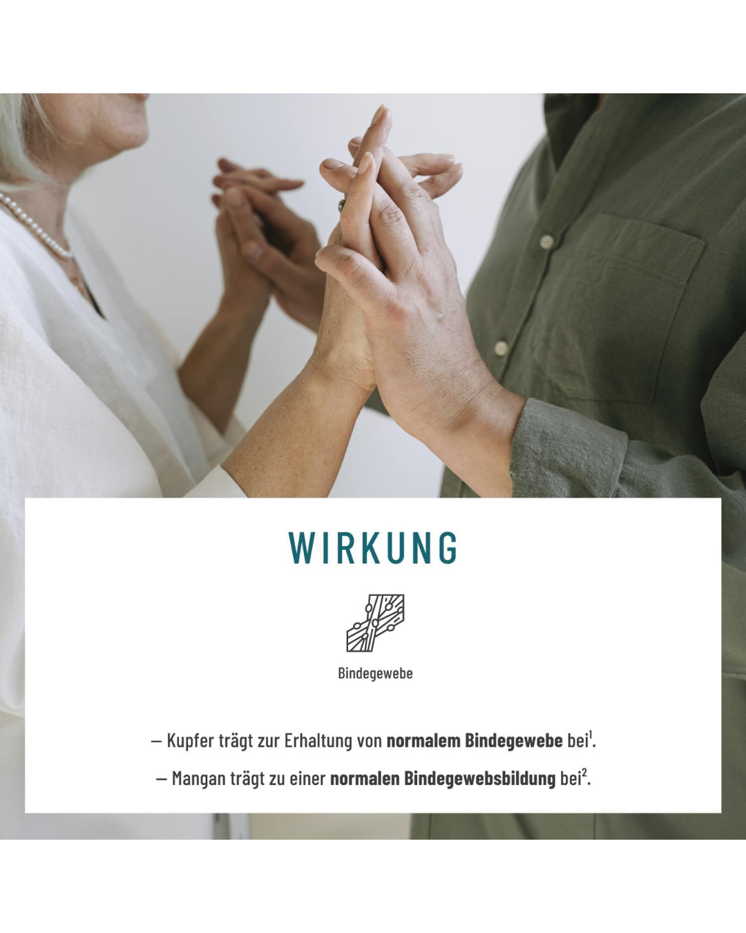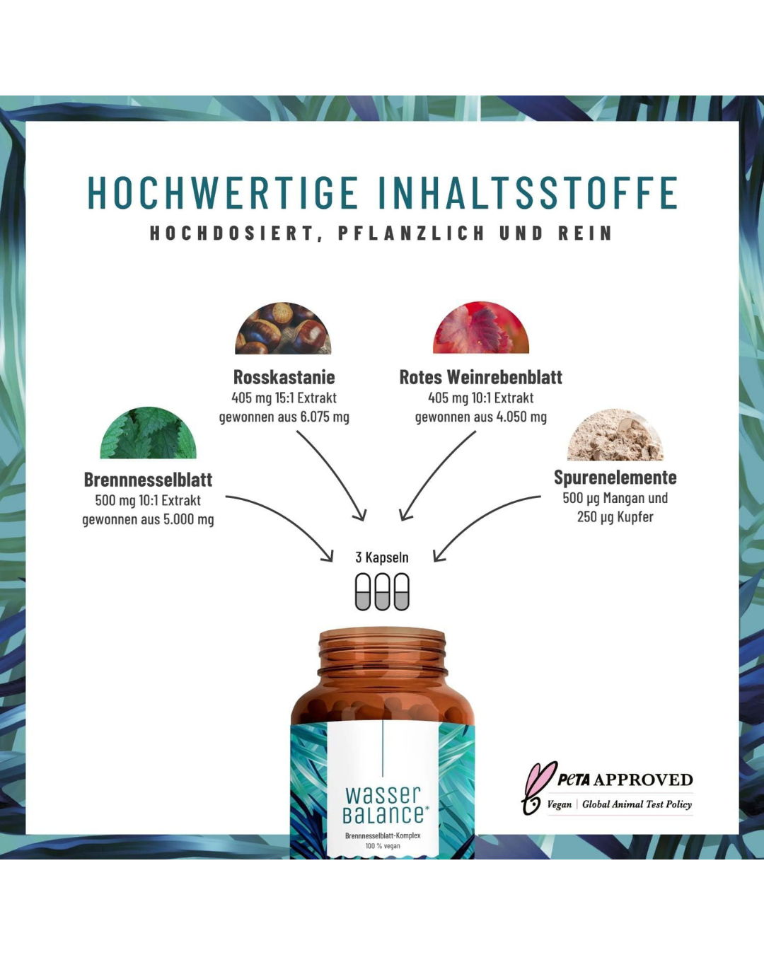 31,2 % Brennnesselblatt-Extrakt 10:1 (Urtica dioica, enthält 2 % Siliciumdioxid), Rosskastanien-Extrakt 15:1 (Aseculus hippocastanum), Roter Weinrebenblatt-Extrakt 10:1 (Vitis vinifera L.) Überzugsmittel: Hydroxypropylmethylcellulose (pflanzliche Kapselhülle), Mangangluconat, Kupfergluconat.