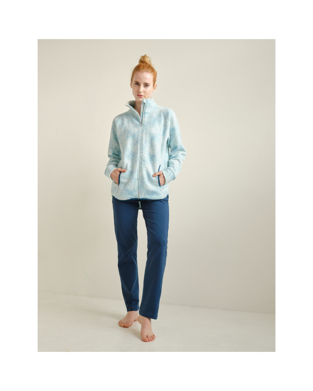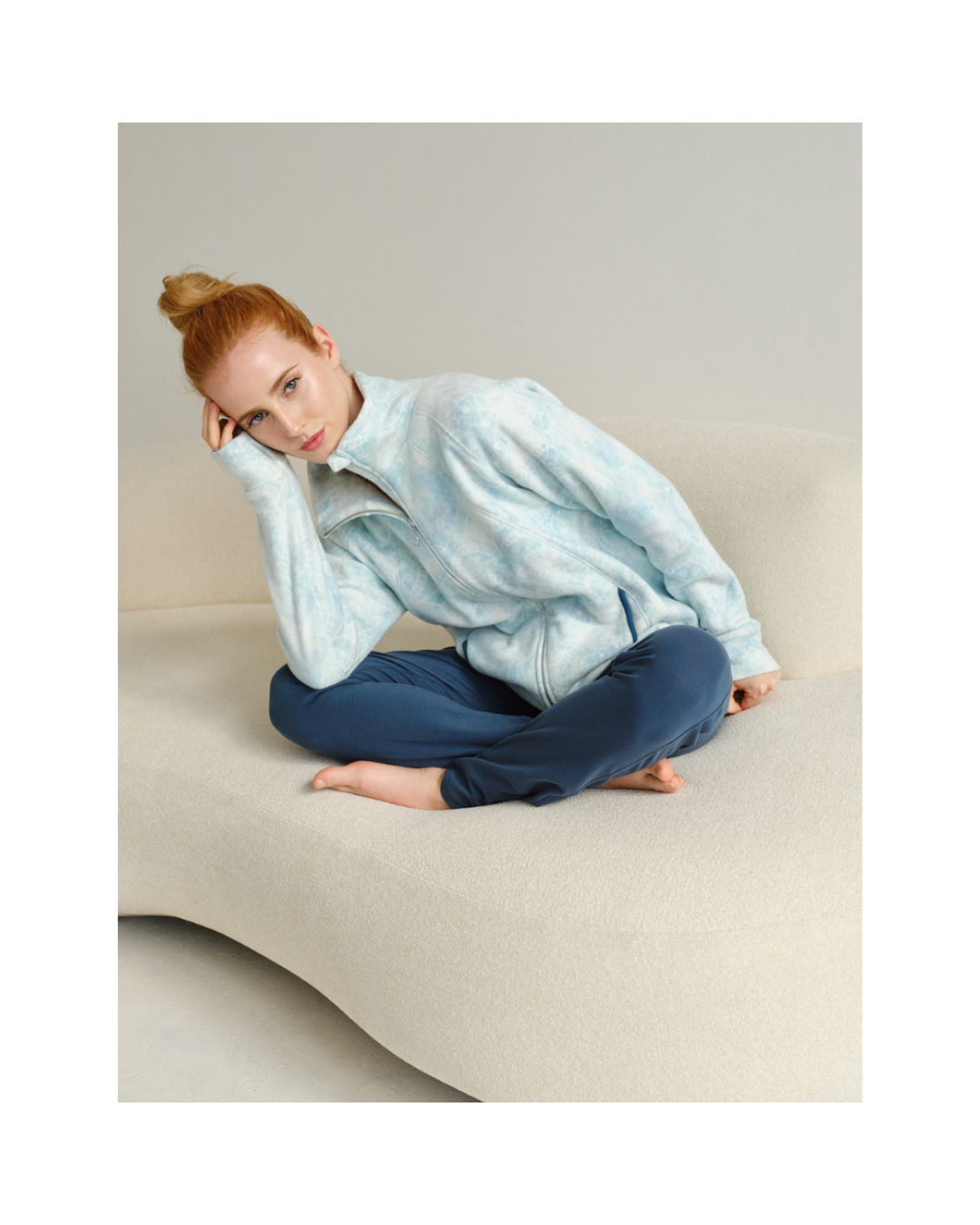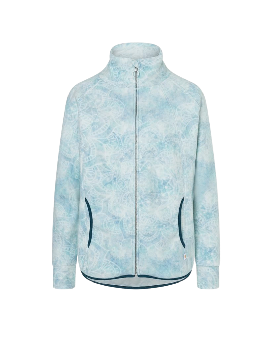 Die Farbvariante Holi zeigt sich als lebendiges Blau mit feinen weißen Strukturen, die wie leichte Wolken über den Stoff verlaufen. Der Alloverprint verleiht der Jacke eine ruhige, zugleich charaktervolle Optik und sorgt dafür, dass jedes Outfit eine besondere Note bekommt.